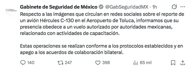 «Respecto a las imágenes que circulan en redes sociales sobre el reporte de un avión Hércules C-130 en el Aeropuerto de Toluca, informamos que su presencia obedece a un vuelo autorizado por autoridades mexicanas, relacionado con actividades de capacitación», resaltó el Gabinete de Seguridad en su cuenta de X.