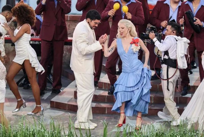 Envuelta en un llamativo atuendo azul, la artista sorprendió al público al interpretar «Die With A Smile» en una versión de merengue, para después sumarse al escenario y bailar junto a Bad Bunny durante los primeros segundos de Baile Inolvidable.