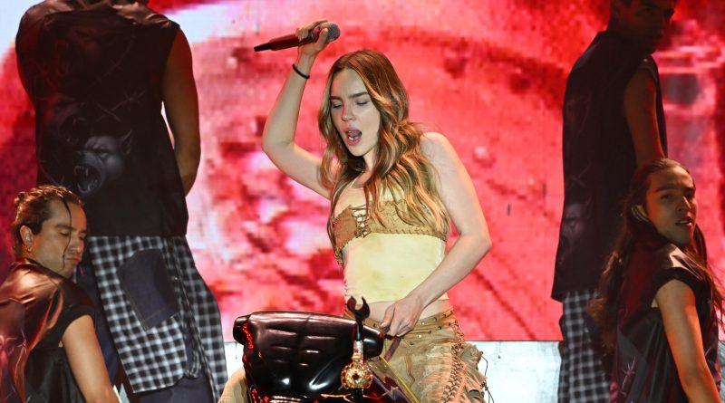 Ataviada con minifalda y top negros, lentes oscuros y unas imponentes alas, “La Beli” abrió con “Ángel”, para luego llevar la energía al máximo con “Lolita”, “Dopamina” y nuevos temas que hicieron vibrar a miles de asistentes. Desde el primer acorde, la conexión con el público fue total, logrando que cada canción se convirtiera en un coro multitudinario.