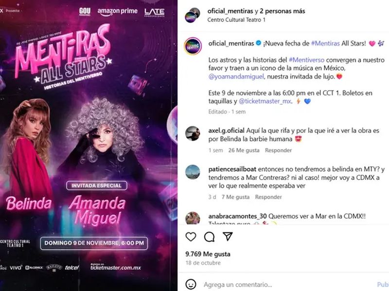 La presencia de Amanda Miguel será uno de los momentos más esperados del evento, ya que la intérprete argentina es la voz original de temas como ‘Él me mintió’ y ‘Castillos’, canciones que forman parte del repertorio emblemático de Mentiras, uno de los musicales más representativos del teatro mexicano contemporáneo.