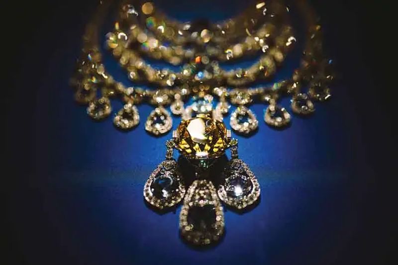 En el collar Patiala de Cartier París, fabricado en 1928, fue exhibido durante una visita de prensa a la exposición Joyas Dinásticas de la Colección Al Thani, en el Hotel de la Marine de París.