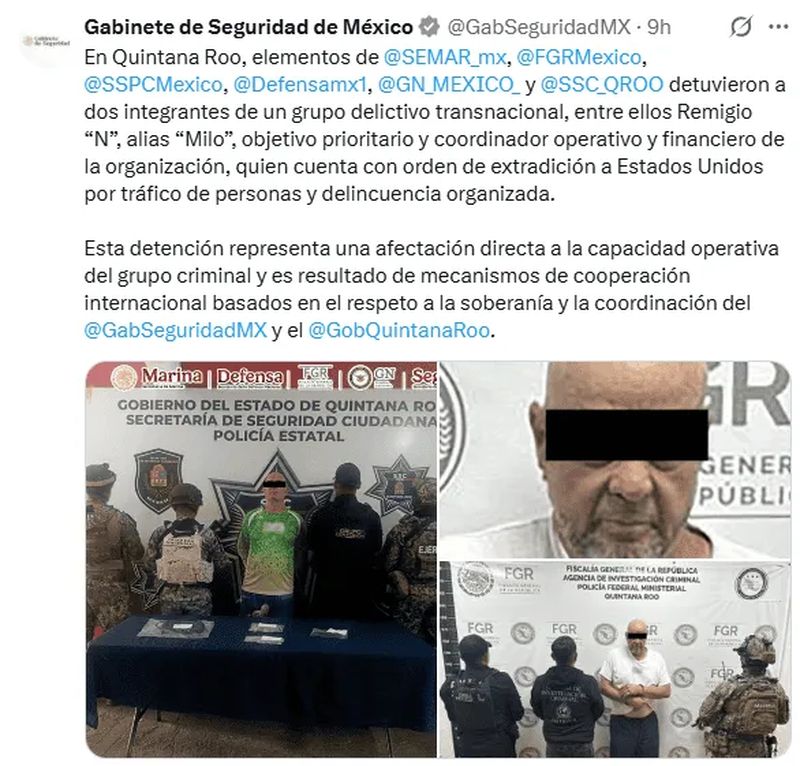 El grupo estratégico destacó que «Milo» cuenta con orden de extradición a Estados Unidos por tráfico de personas y delincuencia organizada. La acción se llevó a cabo por elementos de la Secretaría de Marina, la Fiscalía General de la República, la Secretaría de Seguridad y Protección Ciudadana, la Secretaría de la Defensa Nacional, la Guardia Nacional y la Secretaría de Seguridad Ciudadana de Quintana Roo, en dicha entidad.