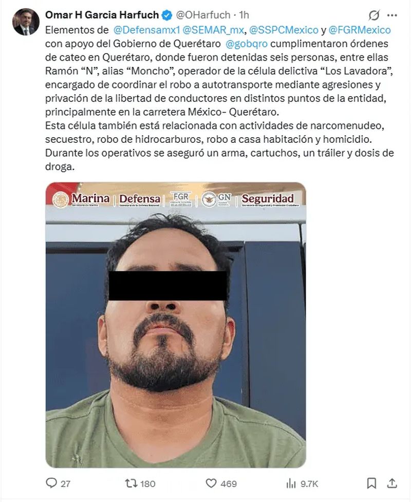 Omar García Harfuch, titular de la Secretaría de Seguridad y Protección Ciudadana (SSPC), dio a conocer esta mañana la captura de seis personas vinculadas con una célula delictiva que operaba en la entidad. Entre los detenidos se encontraba el «Moncho», operador de la célula delictiva “Los Lavadora”.