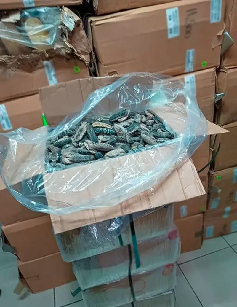 Durante el cateo ejecutado en cinco inmuebles, se aseguraron mil 569 kilogramos de pepino de mar, mil 188 kilogramos de aleta de tiburón, 39 kilogramos de buche de Totoaba, dos mil 227 tortugas de diversas especies y 12 tortugas conocidas como Casquito.