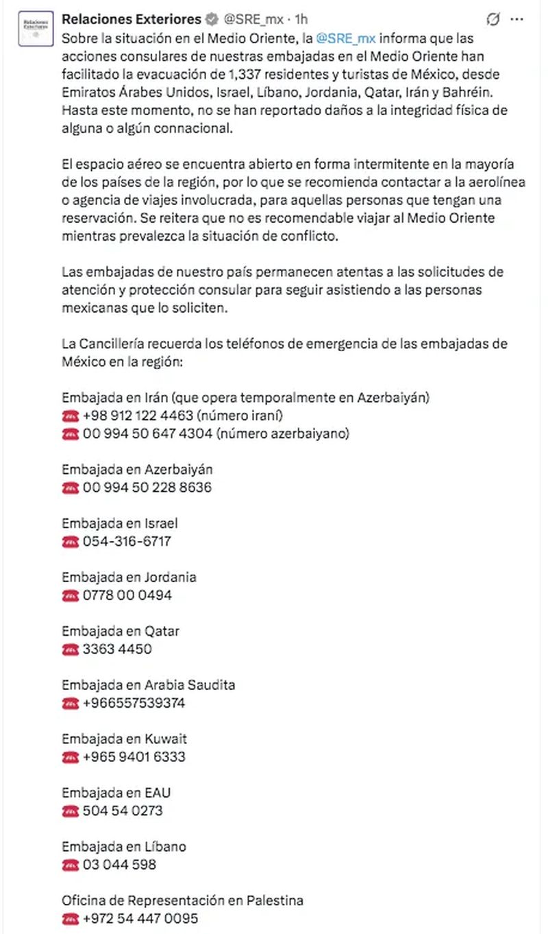 La Secretaría de Relaciones Exteriores (SRE) informó que, sobre la situación en el Medio Oriente, las acciones consulares de las embajadas de la región han facilitado la evacuación de mil 337 residentes y turistas de México, desde Emiratos Árabes Unidos, Israel, Líbano, Jordania, Qatar, Irán y Bahréin.