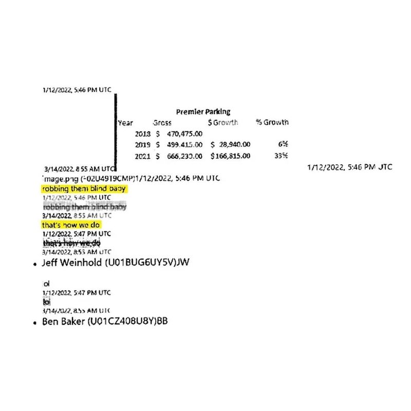 Otro mensaje señalaba: “Tengo el estacionamiento VIP hasta en 250 dólares (4 mil 455 pesos mexicanos). lol”. La empresa intentó eliminar estas pruebas al argumentar que son irrelevantes para el caso y podrían influir de forma injusta en el jurado.