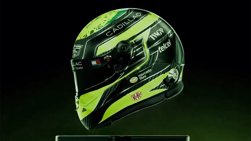 El mexicano, ausente de la parrilla tras su salida anticipada de Red Bull, presentó el diseño del casco que utilizará de forma regular. La pieza mantiene una estética alineada al proyecto de Cadillac, con un marcado verde eléctrico combinado con zonas de fibra de carbono expuesta. El nombre de la escudería aparece en la parte superior y frontal, acompañado por los logotipos de TWG, patrocinador principal del equipo, así como de marcas personales y socios comerciales como Luuna, Nescafé y Tommy Hilfiger.