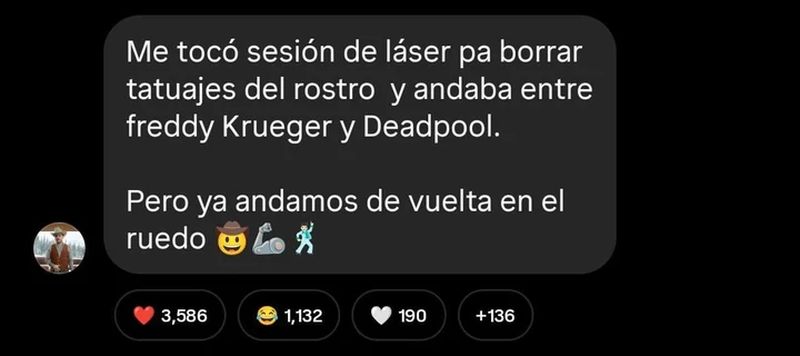 «Me tocó sesión de láser para borrar tatuajes del rostro y andaba entre Freddy Krueger y Deadpool. Pero ya andamos de vuelta en el ruedo», escribió.