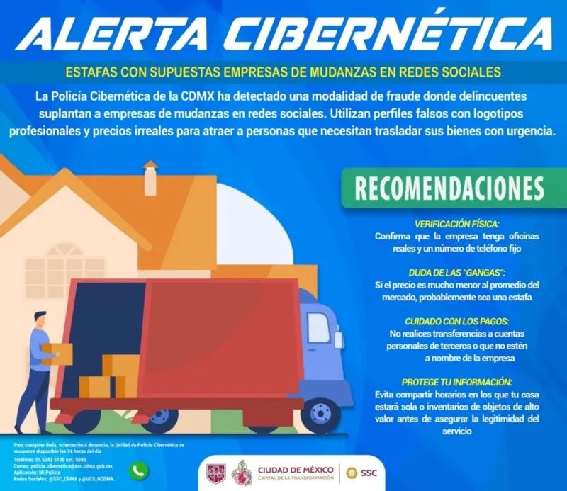 La Secretaría de Seguridad Ciudadana de la Ciudad de México (SSC) emitió una alerta para los usuarios de internet ante un nuevo método de fraude que se difunde a través de redes sociales y plataformas digitales, donde ciberdelincuentes se hacen pasar por empresas de mudanzas para engañar a las personas y obtener dinero de forma ilegal.