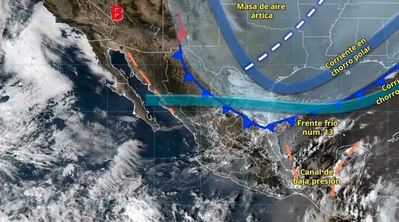El frente frío número 13 recorrerá la península de Yucatán, a su vez, la masa de aire ártica cubrirá la mayor parte del territorio nacional, generando lluvias fuertes a intensas en el sureste mexicano, con lluvias puntuales torrenciales en Veracruz (regiones Papaloapan, Olmeca y Los Tuxtlas) y Oaxaca (norte y este).