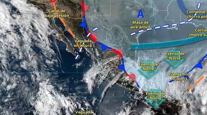 La masa de aire ártico, asociada al frente frío número 13, mantendrá ambiente frío a muy frío en el norte, noreste, oriente y centro de la República Mexicana, con ambiente muy frío a gélido y heladas al amanecer sobre entidades de la Mesa del Norte y la Mesa Central.