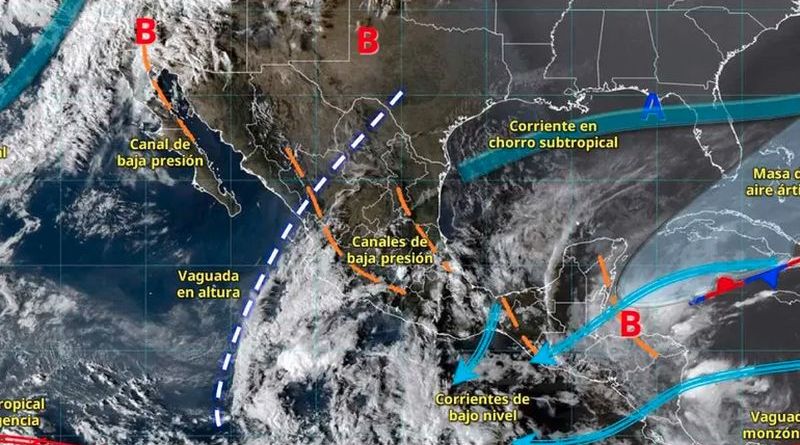 Se prevé durante la noche se aproxime un nuevo frente frío al noroeste del país, asociado con una vaguada polar, una circulación ciclónica en altura y con las corrientes en chorro polar y subtropical, ocasionará lluvias aisladas y fuertes rachas de viento en Baja California.
