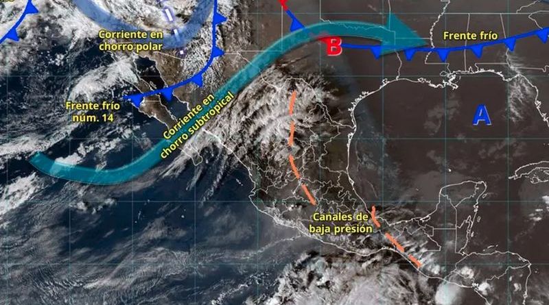Se prevé la llegada de otro frente frío se aproxime rápidamente al noroeste mexicano y, asociado con una circulación ciclónica en niveles medios y altos de la atmósfera y con las corrientes en chorro polar y subtropical, originará lluvias y chubascos, descenso de temperatura y vientos fuertes, pronosticándose lluvias puntuales fuertes en Baja California (norte), con posibles nevadas en las sierras y norte de Sonora.