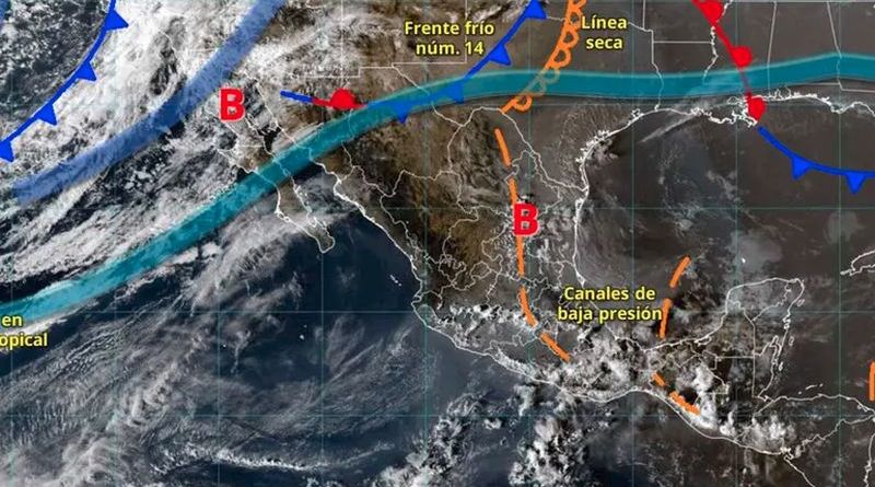 El frente frío número 15 se desplazará sobre el noroeste del territorio nacional en interacción con una vaguada polar, una circulación ciclónica en niveles medios y altos de la atmósfera, y las corrientes en chorro polar y subtropical, ocasionarán lluvias puntuales fuertes, previéndose nevadas en las sierras de Baja California y Sonora.