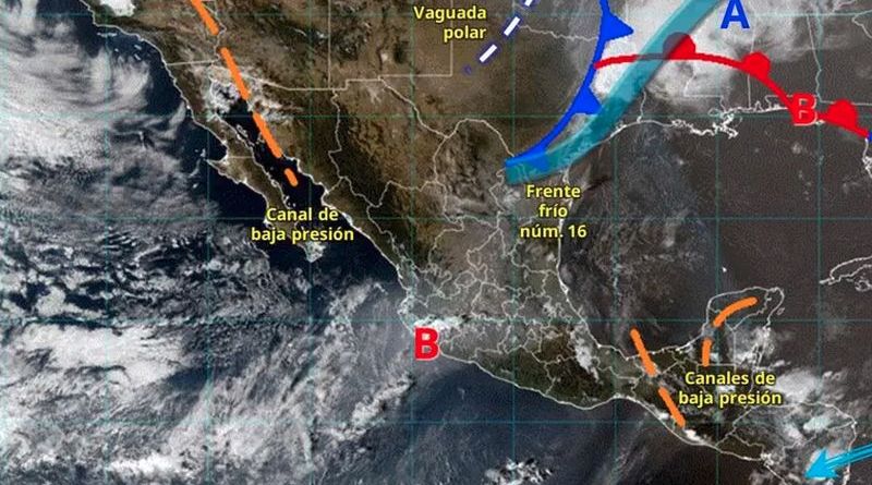 El frente frío número 16 se extenderá sobre el norte y noreste de México, en interacción con la corriente en chorro subtropical y un canal de baja presión generarán lluvias puntuales fuertes con descargas eléctricas en Nuevo León y Tamaulipas, así como chubascos en Coahuila y San Luis Potosí.