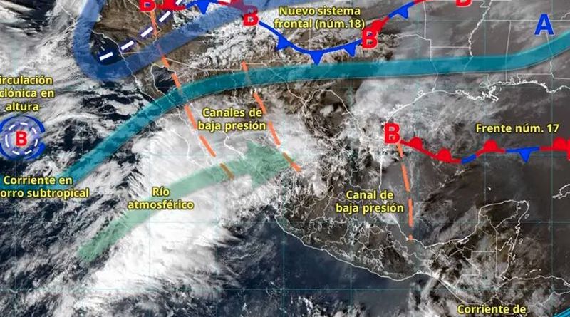 El frente frío número 18 se extenderá sobre el norte y noreste del territorio nacional, interaccionará con una vaguada en niveles medios y altos de la atmósfera y el río atmosférico generando chubascos y lluvias fuertes en el norte el país, con lluvias puntuales muy fuertes, que podrían generar encharcamientos e inundaciones en zonas de Baja California Sur, Sinaloa y Durango.