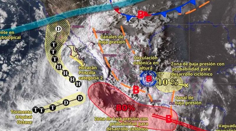 El huracán “Priscilla” se desplazará al oeste de Baja California Sur, su circulación y bandas nubosas ocasionarán lluvias muy fuertes en Baja California Sur, chubascos en Sinaloa y Nayarit; además de rachas de viento fuertes y oleaje de 5.0 a 6.0 metros de altura en la costa occidental de Baja California Sur.