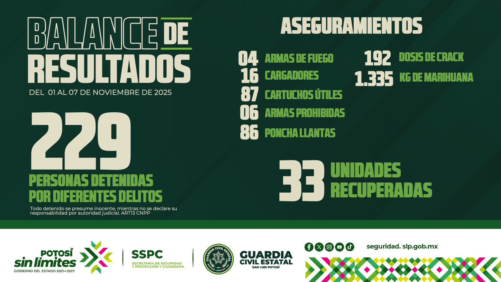 Como resultado de los trabajos especializados en preservar la paz de las y los potosinos, la Guardia Civil Estatal reportó la detención de 229 personas, durante el periodo del 01 al 07 de noviembre del presente año. Además, se informó la localización de 25 automóviles y ocho motocicletas, dando un total de 33 unidades motoras, que tenían reporte de robo.