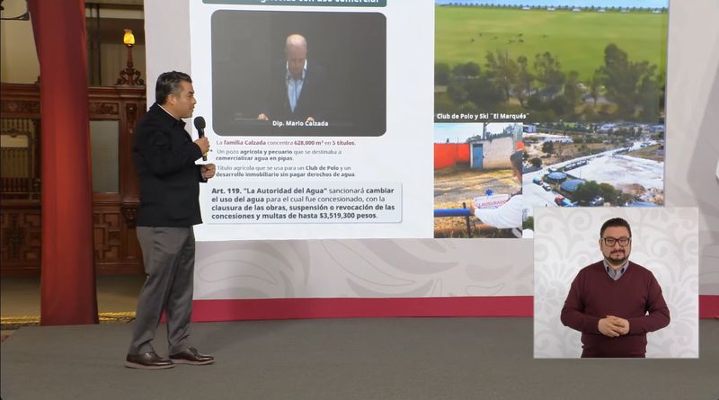 Durante la mañanera se mostró al diputado priista Mario Calzada que se opuso a la reforma y cuya familia concentra 628 mil m3 en cinco títulos en Querétaro, los cuales habían sido otorgados para uso agrícola, así no pagando agua, pero en cambio la familia la usaba para comercializar agua en pipas, regar un club de polo y un desarrollo inmobiliario.