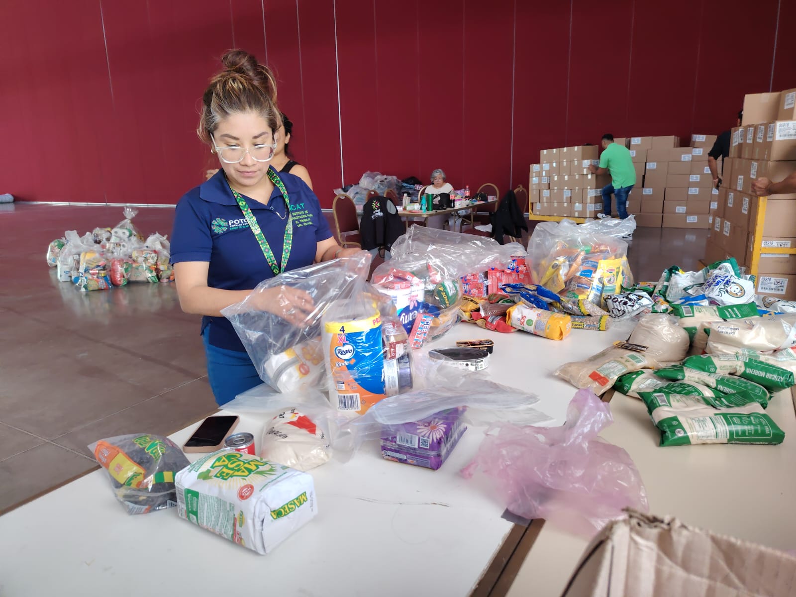 En este espacio se trabaja de manera coordinada con personal de diversas dependencias para integrar los paquetes alimentarios y de primera necesidad que se distribuirán en las próximas horas para las y los afectados y las 300 personas que aún se encuentran en los refugios habilitados.