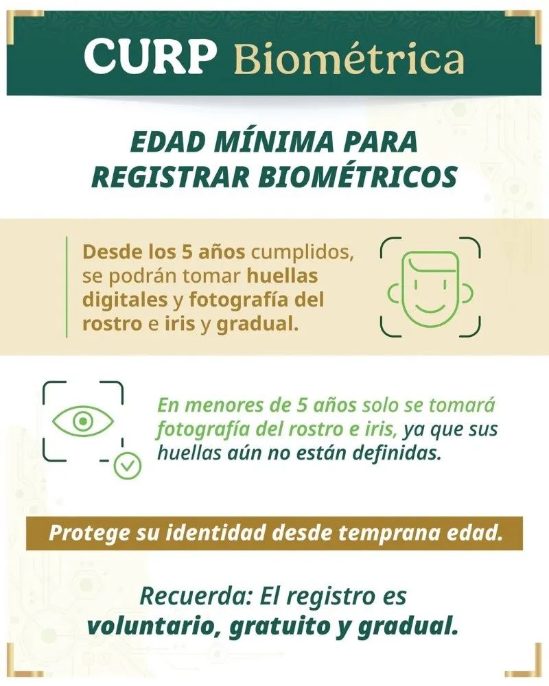 Según la información difundida, cualquier persona puede solicitar su CURP biométrica sin importar la edad. Sin embargo, el registro completo de datos biométricos será posible a partir de los 5 años, ya que a esa edad las huellas dactilares están completamente formadas.