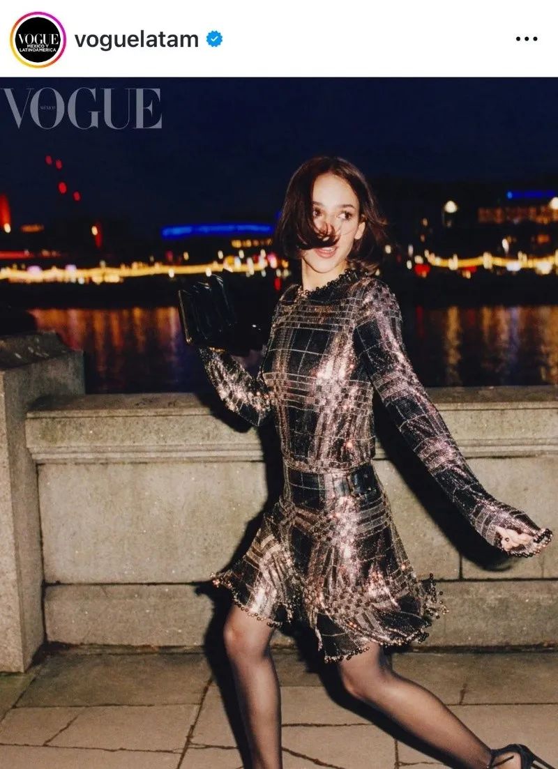 El look de portada retoma los códigos clásicos de la maison: camisa negra de líneas limpias con moño estructurado al cuello y minifalda de corte preciso. La silueta enfatiza el torso y las piernas, creando un balance entre formalidad y modernidad. La construcción responde al ADN de Dior, donde la sastrería define la postura y la prenda actúa como marco del cuerpo, no como adorno. El resultado es una imagen pulida, con una estética que remite al uniforme reinterpretado desde la alta moda.