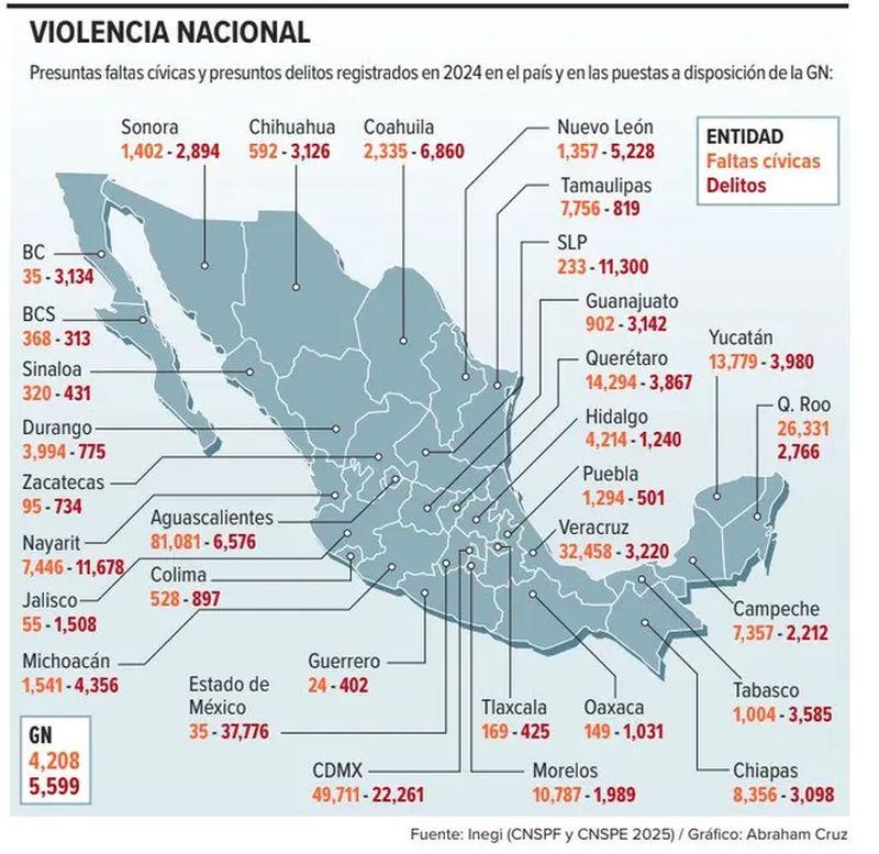De acuerdo con el Censo Nacional de Seguridad Pública Federal y Estatal 2025, la Guardia Nacional (GN) reportó durante 2024 46 robos y asaltos en carreteras federales, 71.3% menos en comparación con el año previo.