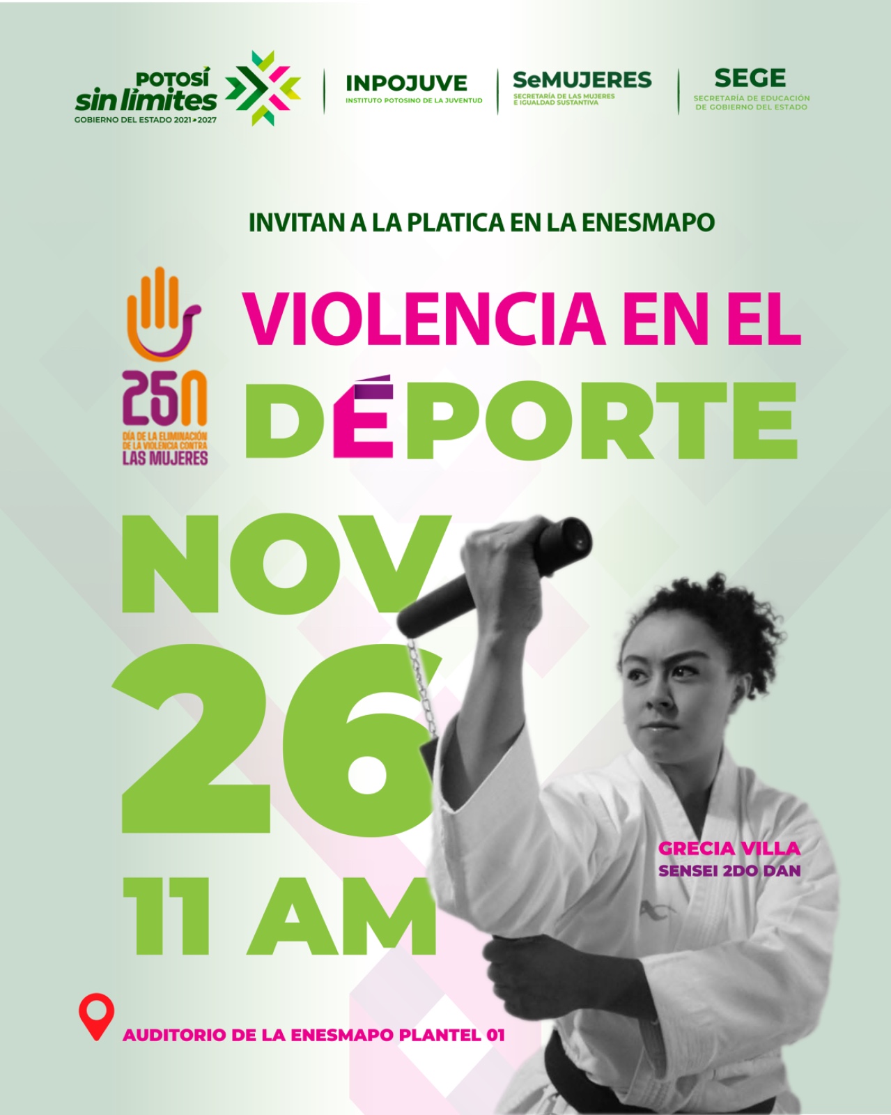 Como parte de las actividades por el 25 de noviembre Día Internacional de la Eliminación de la Violencia contra la Mujer, el Instituto Potosino de la Juventud (Inpojuve) y la Secretaría de las Mujeres e Igualdad Sustantiva (Semujeres), invitan a participar en el taller de defensa personal “Tu cuerpo, tu poder”, impartido por la sensei segundo Dan en Karate Do, Grecia Villa, el próximo 25 de noviembre a las 11:00 horas en las instalaciones del Inpojuve.