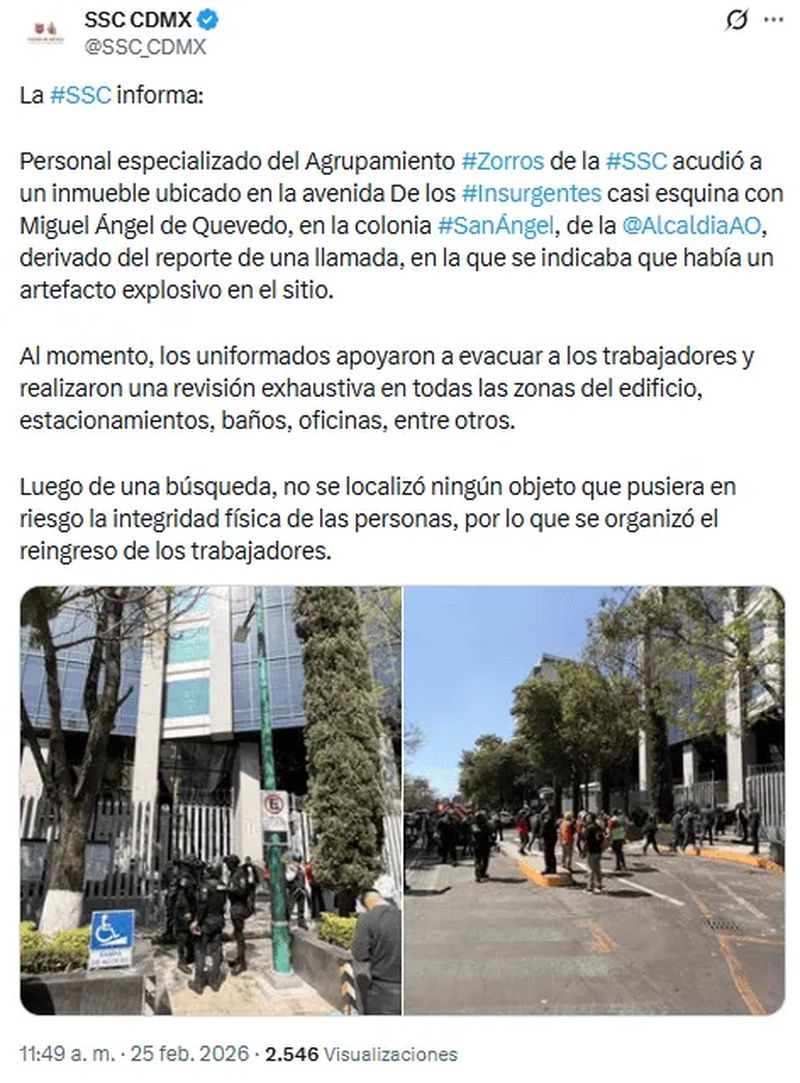 De acuerdo con información de la Secretaría de Seguridad Ciudadana de la Ciudad de México (SSC) difundida a través de sus redes sociales, personal especializado del Agrupamiento Zorros acudió al sitio luego de recibir una llamada en la que se alertaba sobre la posible presencia de un artefacto explosivo dentro del edificio.