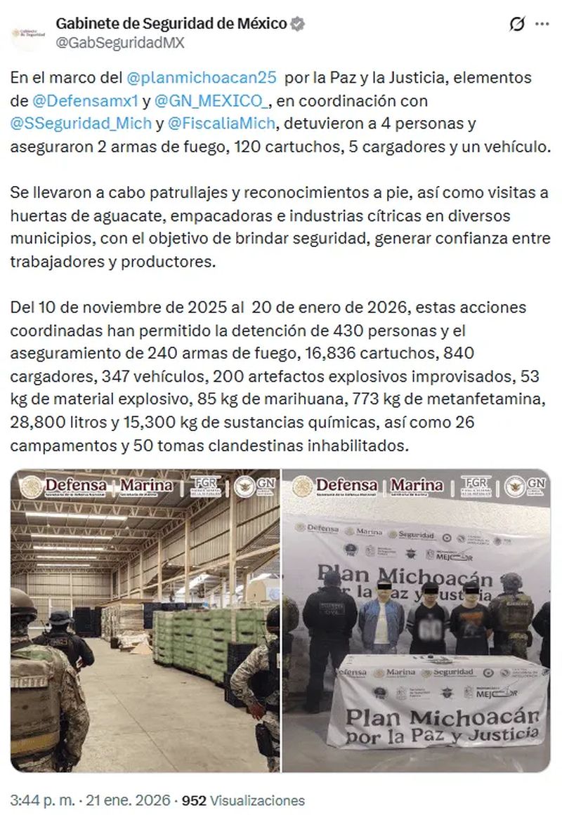 El Plan Michoacán 25 por la Paz y la Justicia ha arrojado resultados contundentes