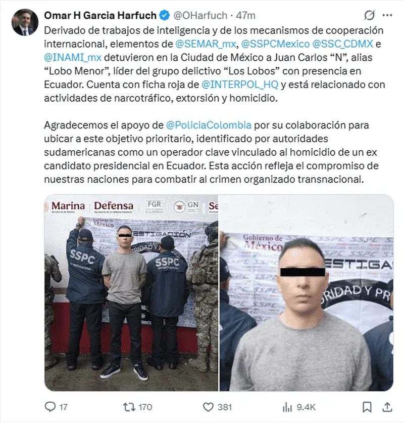 El titular de la Secretaría de Seguridad y Protección Ciudadana (SSPC), Omar García Harfuch, compartió en redes sociales que elementos de seguridad del Gobierno de México detuvieron Juan Carlos «N», «Lobo Menor», que cuenta con ficha roja emitida por la Interpol.