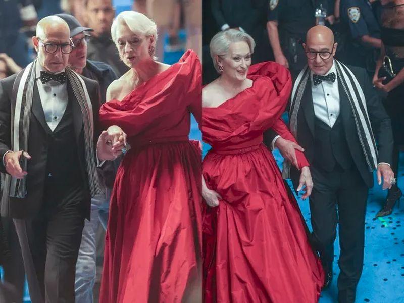 En las fotografías, la actriz viste un voluminoso vestido rojo junto a Stanley Tucci, quien interpreta a Nigel, ambos posan con impecables looks. Esta secuela promete una narrativa de moda de alto impacto, tensiones profesionales y empoderamiento femenino.
