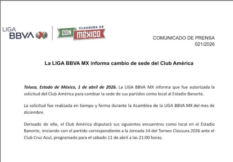 De acuerdo con el comunicado oficial, las Águilas volverán al Coloso de Santa Úrsula para disputar el Clásico Joven ante Cruz Azul el próximo sábado 11 de abril a las 21:00 horas, marcando el fin de su itinerancia por otras sedes del país.