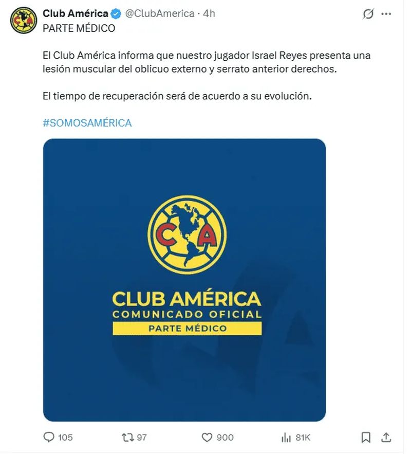 «El Club América informa que nuestro jugador Israel Reyes presenta una lesión muscular del oblicuo externo y serrato anterior derechos. El tiempo de recuperación será de acuerdo a su evolución», se puede leer en la publicación de redes sociales.