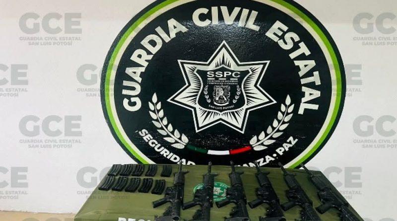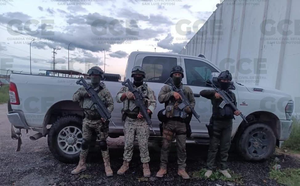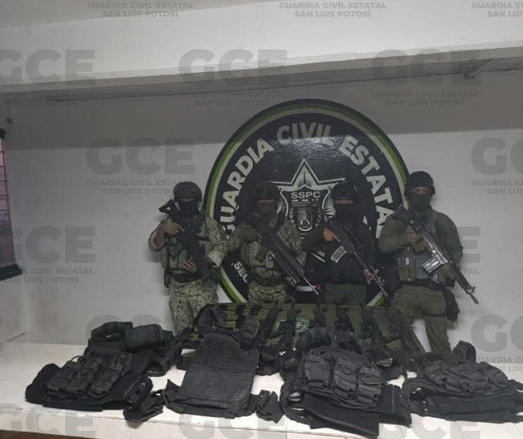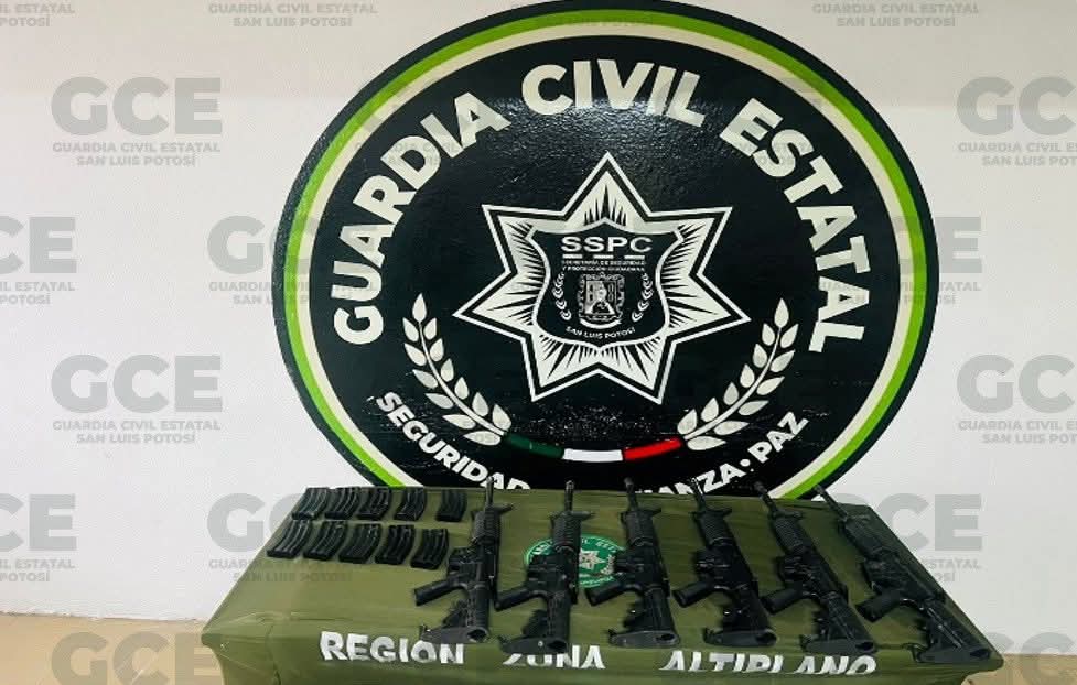 Los dispositivos de seguridad en coordinación con la Guardia Nacional, dentro del dispositivo Base de Operaciones Mixtas Interinstitucional (BOMI) en el municipio de Matehuala, permitieron que nuestros elementos, aseguraran en Camino a San José del Plan, una camioneta Dodge Ram doble cabina color blanco, en la cual se encontraron seis armas largas calibre 5.56 milímetros, 10 cargadores, siete chalecos tácticos y 100 cartuchos útiles calibre .223/5.56.