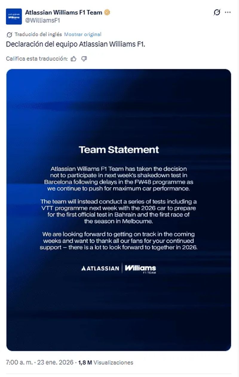 «Esperamos con ansias estar en la pista en las próximas semanas y queremos agradecer a todos nuestros fanáticos por su continuo apoyo; hay mucho que esperar juntos en 2026», agregó Williams.