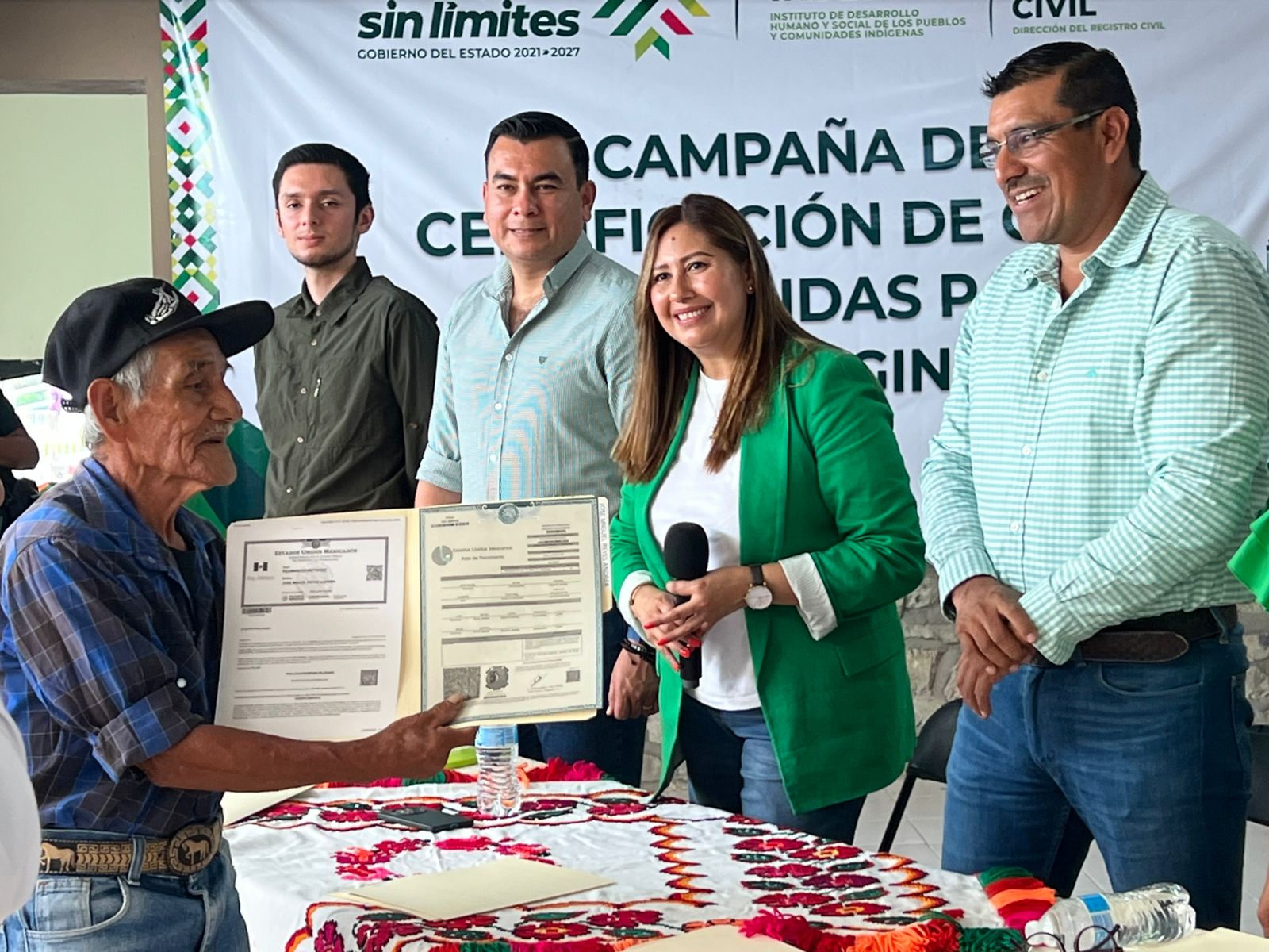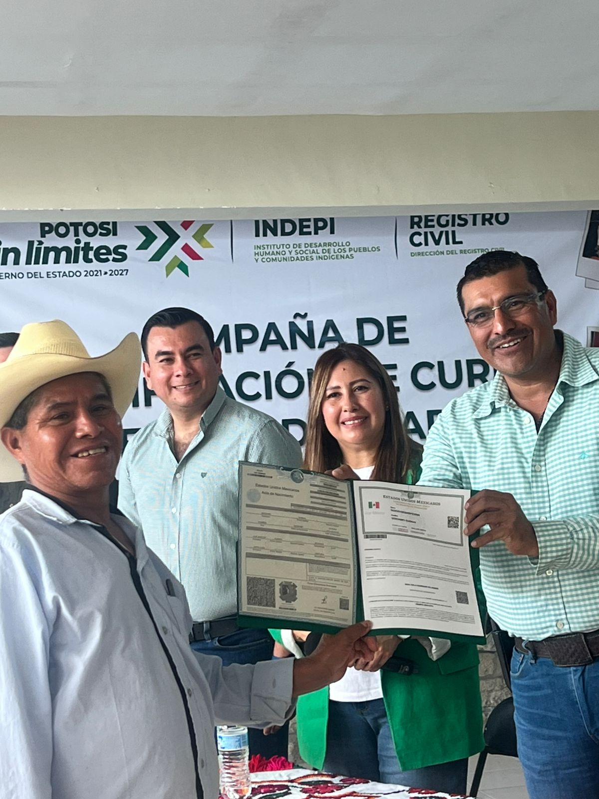 Siguiendo la instrucción del Gobernador Ricardo Gallardo Cardona de garantizar el derecho a la identidad, la Secretaría General de Gobierno (SGG), a través de la Dirección de Registro Civil, y el Instituto de Desarrollo Humano y Social de los Pueblos y Comunidades Indígenas (Indepi) impulsan sin límites la Campaña de Certificación de CURP y Enmiendas para Pueblos Originarios, además de reforzar la capacitación y acercamiento de servicios en comunidades indígenas. En esta primera etapa, se entregaron documentos a 74 personas en Aquismón, brindando certeza jurídica a quienes más lo necesitan.
