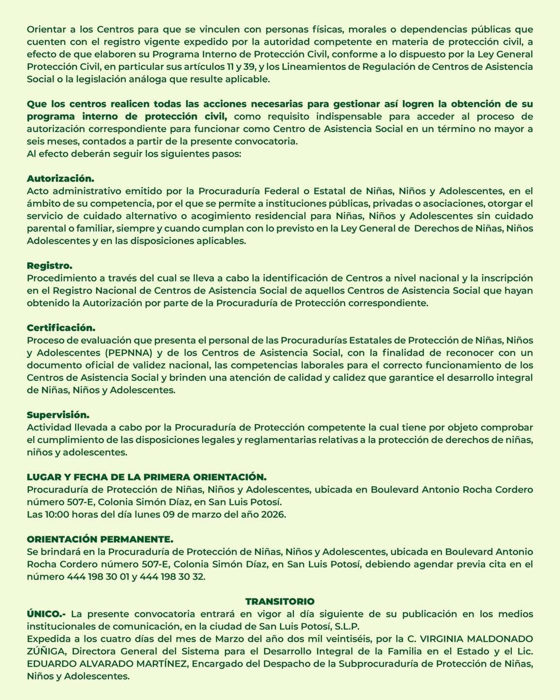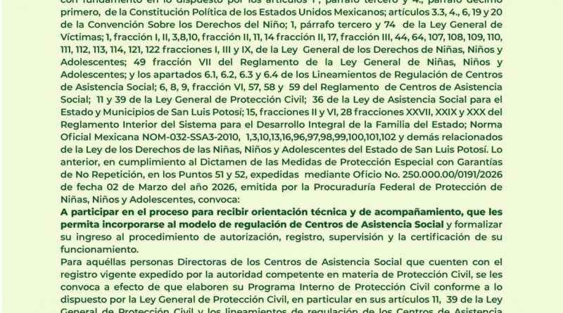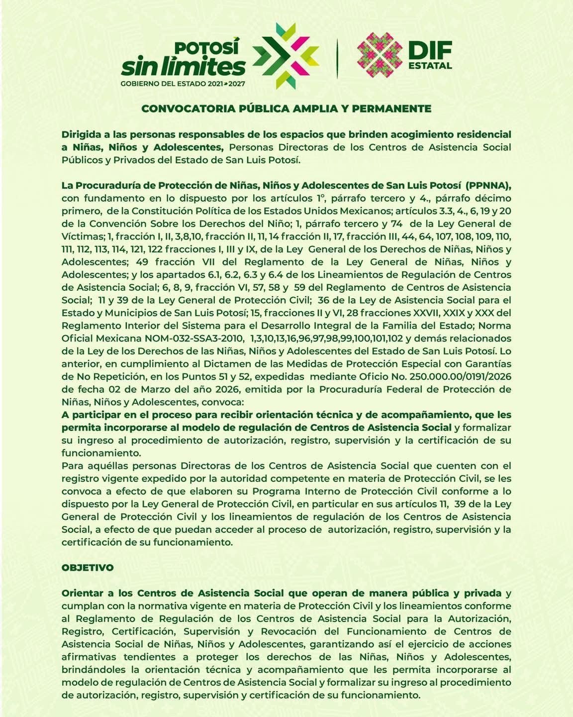 Como parte del compromiso del Gobernador Ricardo Gallardo Cardona, de fortalecer la protección de niñas, niños y adolescentes, el Sistema Estatal para el Desarrollo Integral de la Familia (DIF), a través de la Procuraduría de Protección de Niñas, Niños y Adolescentes (PPNNA), emitió una convocatoria pública amplia y permanente dirigida a los Centros de Asistencia Social (CAS) públicos y privados, para orientarlos en su proceso de autorización, registro, supervisión y certificación de su funcionamiento.