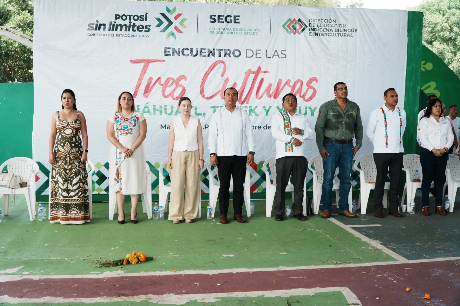 La Secretaría de Educación de Gobierno del Estado (SEGE) realizó el Encuentro de las Tres Culturas: náhuatl, tének y xi’iuy, en Matlapa, que incluyó el tradicional ritual Mikawuljuitl, dedicado a las autoridades educativas y municipales, en un acto simbólico de respeto y hermandad como parte de las acciones para la preservación de las raíces culturales que dan identidad a San Luis Potosí.