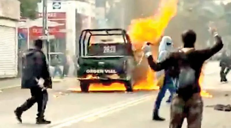 Tras la primera confrontación, los estudiantes detuvieron una patrulla y la incendiaron en inmediaciones de las instalaciones de Rectoría, que los universitarios mantienen tomadas desde hace meses.