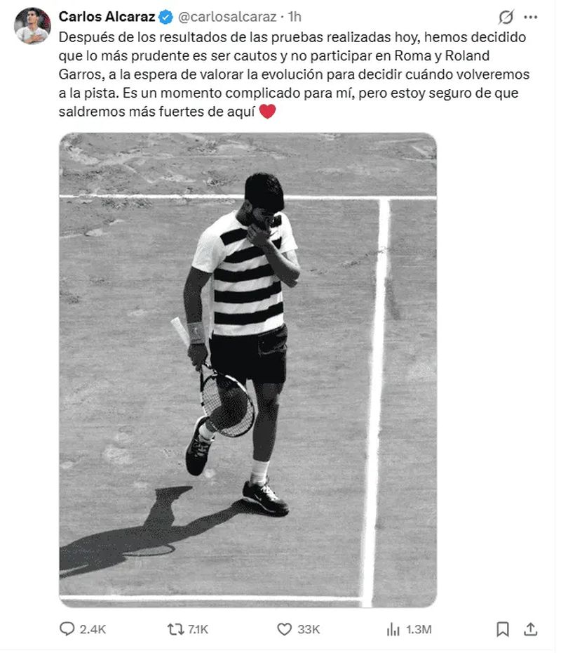 «Después de los resultados de las pruebas realizadas hoy, hemos decidido que lo más prudente es ser cautos y no participar en Roma y Roland Garros», escribió en X.
