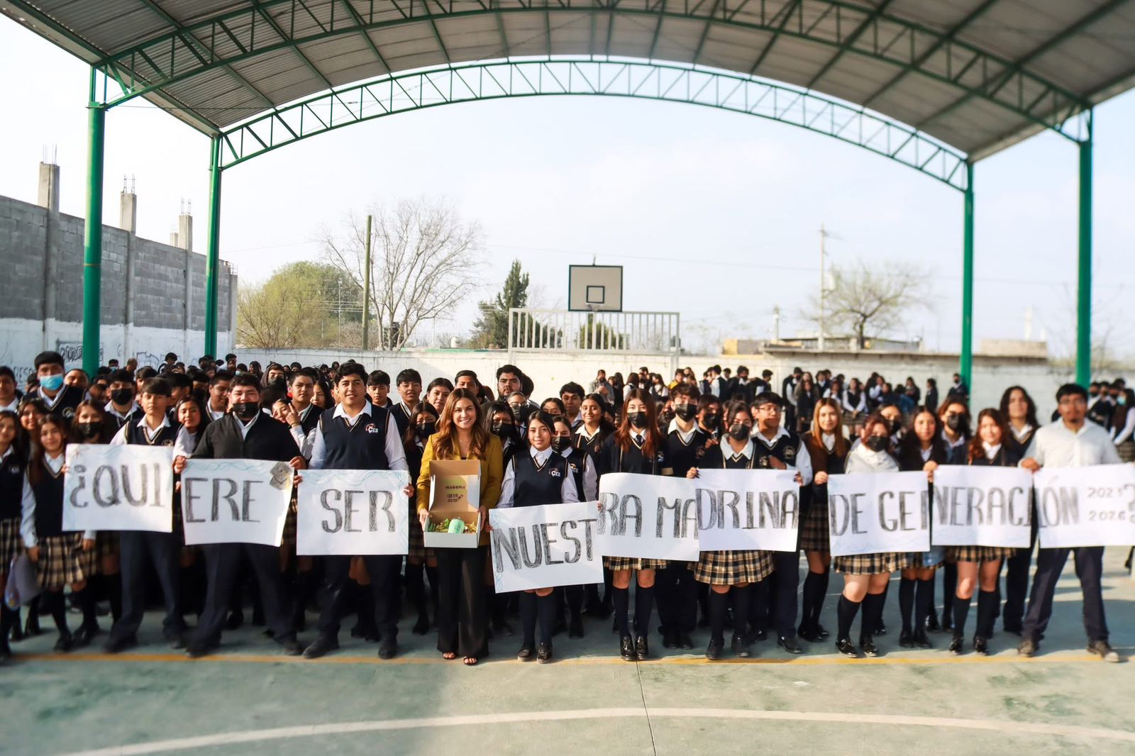 Para finalizar, alumnas y alumnos que están por egresar de la generación 2023–2026 hicieron entrega de un presente a la alcaldesa y aprovecharon el momento para invitarla a ser madrina de generación, propuesta que fue aceptada con entusiasmo por la Presidenta Municipal ante la emoción y aplausos de la comunidad escolar. 🎓✨