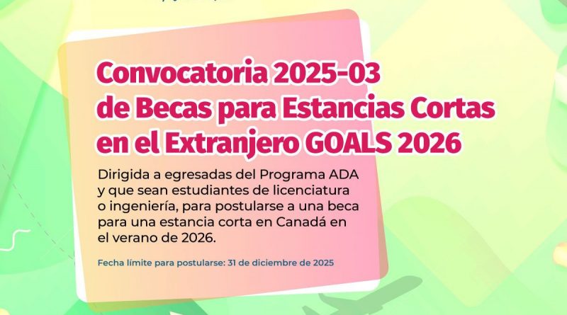 El Consejo Potosino de Ciencia y Tecnología (Copocyt) invita a mujeres estudiantes de licenciatura o ingeniería, egresadas del programa ADA, a participar en la Convocatoria 2025-03 de becas “Go Abroad: Learning for Sustainability (GOALS) 2026”, que permitirá cursar una estancia corta en la Universidad de Waterloo, Canadá, durante el verano del próximo año. El programa fomenta el aprendizaje basado en proyectos, el pensamiento crítico, la resolución creativa de problemas y la comunicación colaborativa, todo enfocado en los Objetivos de Desarrollo Sostenible y la mejora del dominio del inglés.