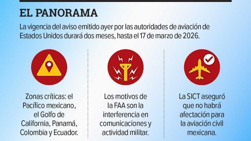 En su comunicado, la SICT mencionó que este tipo de comunicación preventiva es similar a otros NOTAM emitidos previamente por la FAA, como los registrados semanas atrás en la región del Caribe y que ahora se extienden al área del Pacífico.