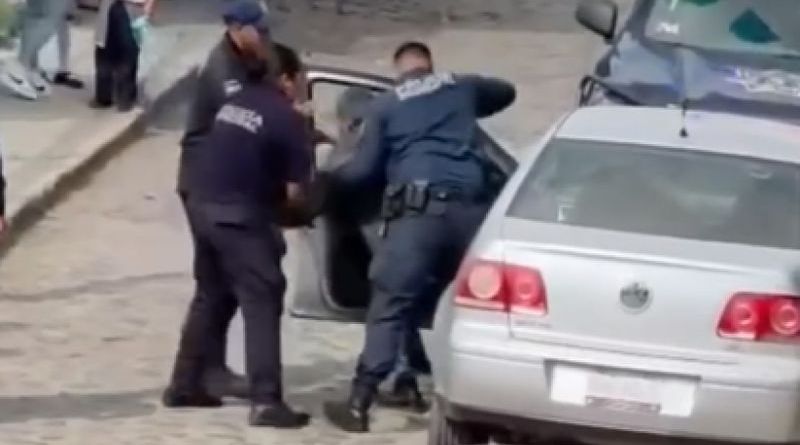 Según las imágenes que circulan en plataformas digitales, los hechos habrían ocurrido en una vialidad de la comunidad de San Miguel Regla, cuando elementos de la Policía Municipal interceptaron a un hombre de la tercera edad que conducía un automóvil Volkswagen de color gris.