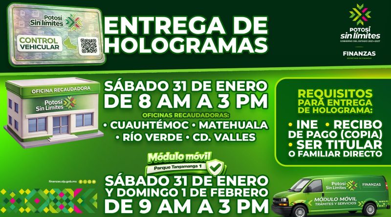 Con el cambio que se vive y se siente en la administración Estatal y para apoyar a las y los potosinos en la obtención del holograma 2026, este sábado 31 de enero se ampliará la atención en oficinas recaudadoras de Cuauhtémoc, Matehuala, Rioverde y Ciudad Valles, de 8:00 a 15:00 horas, exclusivamente para la entrega de hologramas a quienes realizaron su pago por medios electrónicos o bancarios.