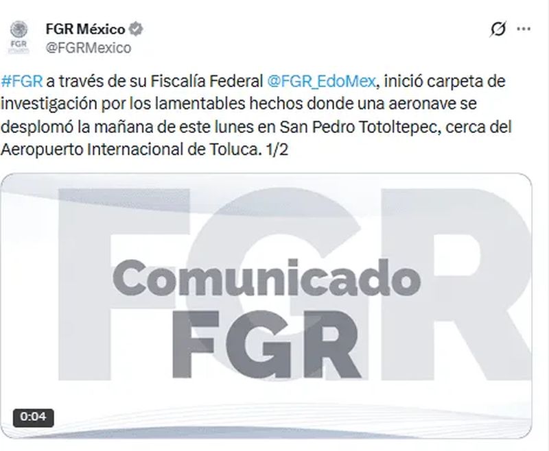 En un comunicado, garantizó que coadyuvará en la investigación y procederá conforme a derecho. Gobierno del Estado de México, en silencio A nueve horas del accidente aéreo, el Gobierno del Estado de México sólo informó en sus canales oficiales que se activaron protocolos de emergencia y coordinación con cuerpos de rescate en atención al siniestro en Toluca.