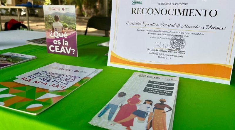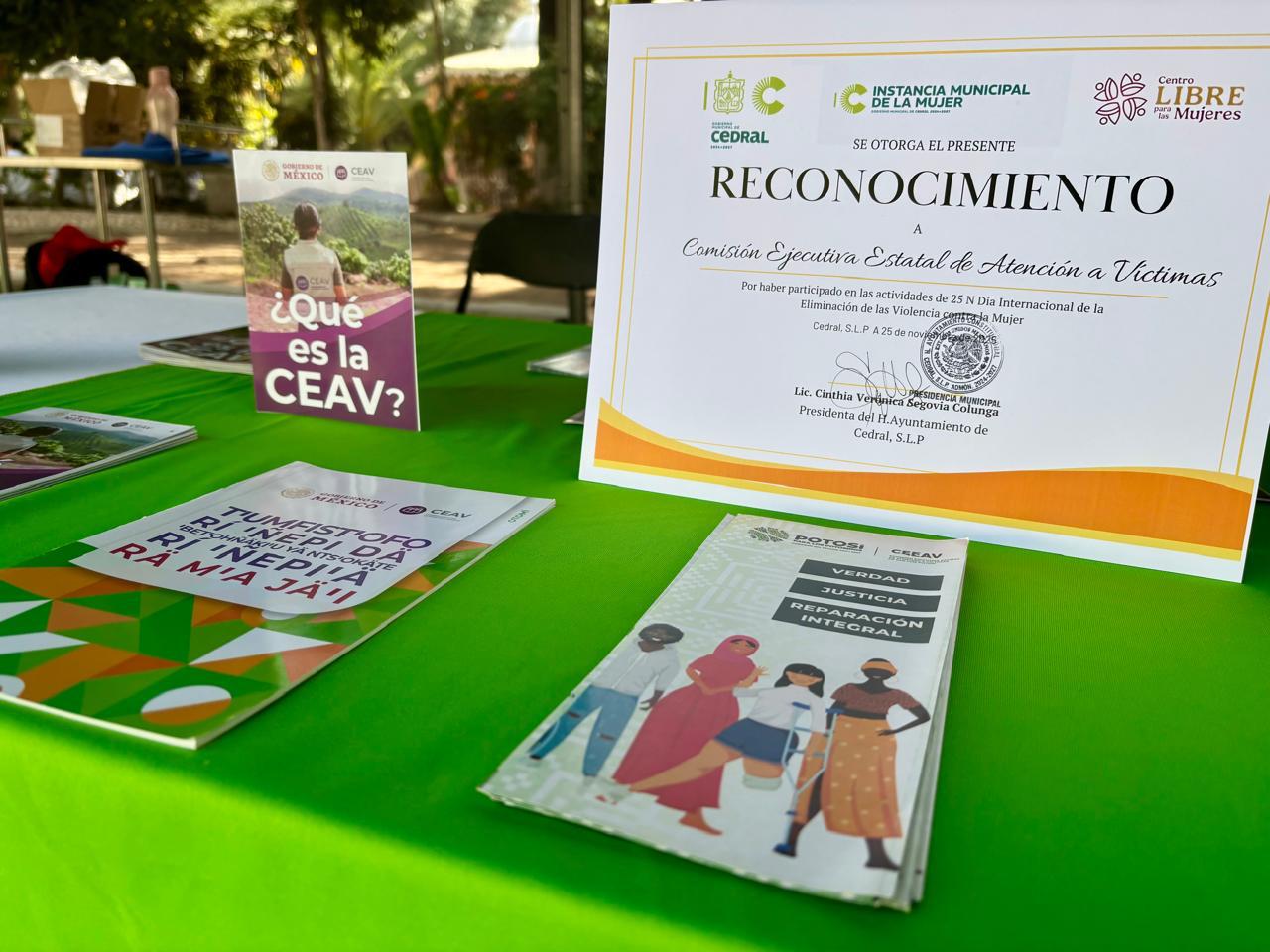 En seguimiento a la instrucción del Gobernador del Estado Ricardo Gallardo Cardona, la dependencia brindó información a mujeres de Cedral sobre los servicios institucionales de la CEEAV y otras dependencias que participaron, con lo que refrendó el compromiso con la atención integral, el acceso a la justicia y la promoción de espacios seguros para mujeres y niñas