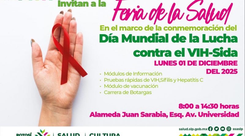 Los Servicios de Salud, a través de la Coordinación Estatal de VIH/sida e Infecciones de Transmisión Sexual y Virus de Hepatitis C, invitan a sumarse a la conmemoración del Día Mundial de la Lucha contra el SIDA, con el propósito de promover el respeto a los derechos humanos y brindar información clave para la prevención. Este 1 de diciembre las siete Jurisdicciones Sanitarias realizarán actividades alusivas a la fecha; en la capital se llevará a cabo una Feria de la Salud en la Alameda Juan Sarabia, donde se ofrecerán módulos de información, vacunación y pruebas rápidas para la detección de VIH, sífilis y hepatitis C.