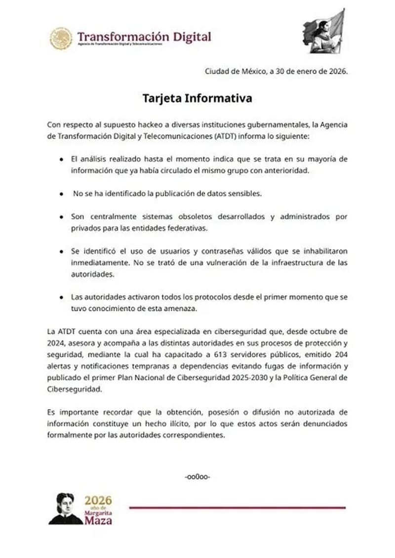 El Gobierno de México rechazó que se haya registrado una filtración de información sensible tras las versiones difundidas en redes sociales sobre un supuesto ciberataque a dependencias federales. La aclaración fue emitida por la Agencia de Transformación Digital y Telecomunicaciones (ATDT) mediante una tarjeta informativa.